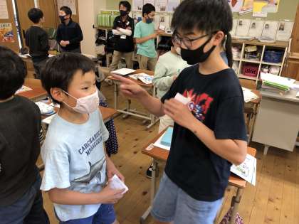 外国語科の学習で名刺交換をしました。学習してきた言葉を使い友だちにたずねます。「What color do you like?」