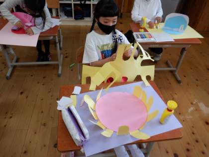 わりピンを使って回る仕組みから想像を広げ,一人ひとりの「くるくるランド」を作りました。くるくる回すことで場面を変えたり,動きを出したり工夫をして作ることができました。