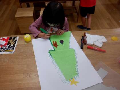 「この形はヘビに見える」「恐竜みたい」とつぶやきながら画用紙に貼っていきました。