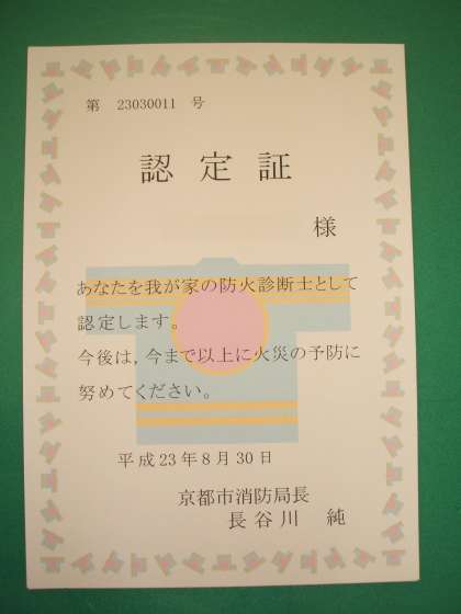 「我が家の防火診断士」認定証をいただきました。