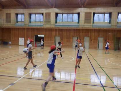 今日はボールを使った体ほぐしをしました。上に投げたボールを1回転してキャッチしたり,ペアで同時にボールを投げてキャッチしたりしました。