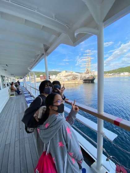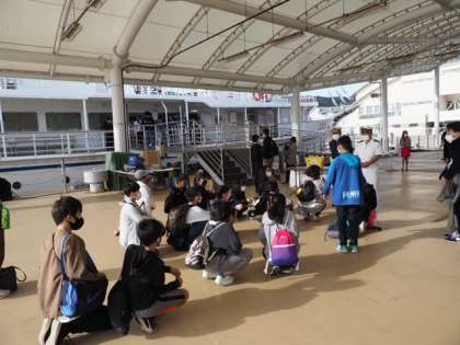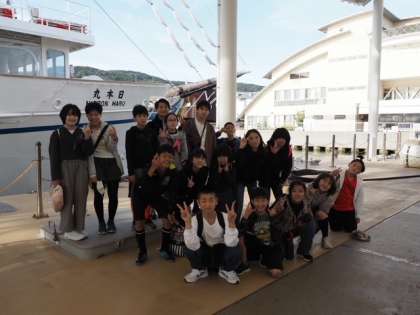 一行は福良港に到着。日本丸に乗り込み,うず潮クルーズが始まりました。