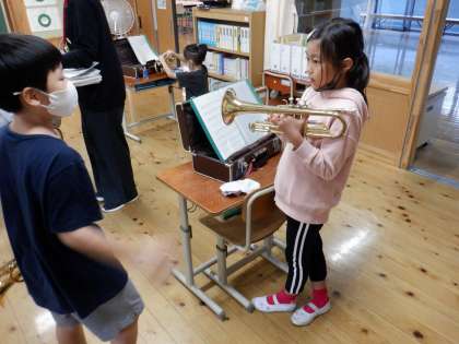 4年生は,3年生にきらきら星の吹き方を教えています。少しずつ,教えるということにも慣れてきました。3年生の音色も,回数を重ねるごとに美しくなってきています。