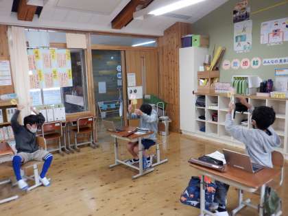 音楽科の学習では,「ファランドール」を鑑賞しました。体を動かしたり旋律を特徴を記号で表したりしながら,旋律のかけあいや重なりに気付くことができました。