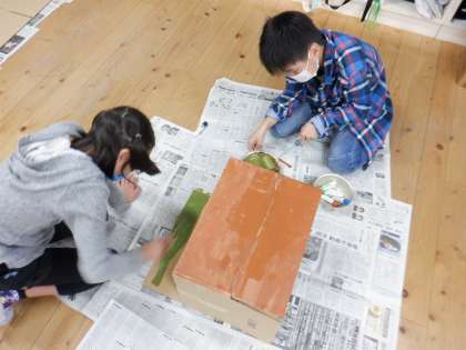 段ボール箱を開いたり立たせたりした形から思い付いたこともとに,友だちと表したいことを考え,協力して,模様をつけたり,絵を描いたりしました。