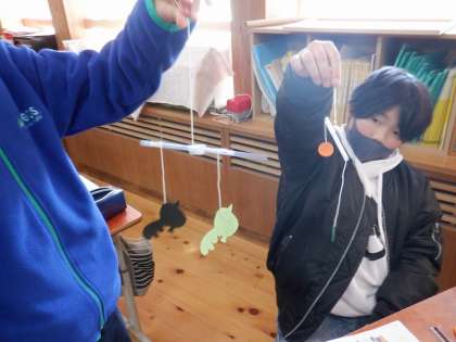 てこのつり合いを利用して「モビール」というおもちゃを作りました。糸につるす飾りの重さや支点から糸をつるすまでの距離などを考えて作っていました。