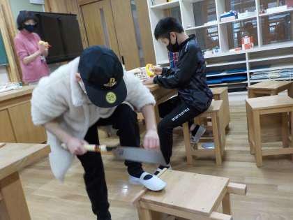 今日は,木やくぎを使って,ひみつのすみかをつくりました。組み合わせや位置などを工夫しながらつくっていました。