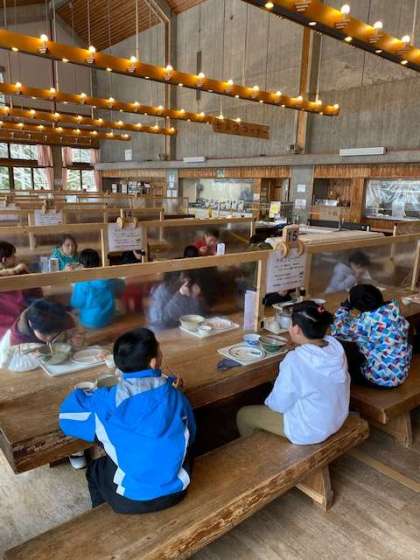 きつねうどんをメインにおかず数種の昼食です。ご飯やおかずのおかわりができて、空腹にうれしいお昼ご飯でした。