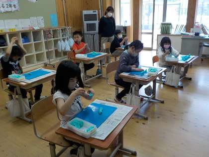 今日は,初めての図工です。にぎってできた形から,思いついたものを考えて作品にしていきました。