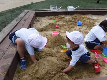 砂を固めて形をつくったり,山の中にトンネルを掘ったりと,楽しみながら砂で遊びました。
