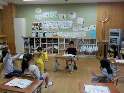 2拍子のリズムに合わせて,手拍子を打ったり体を動かしたりしています。みんなの息もぴったりです。