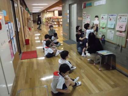 心電図検査の前に,保健室前の展示物を使って,検査の様子をシュミレーションしました。