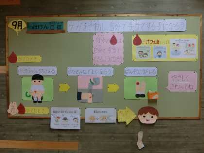 今月のほけんもくひょう「ケガを予防し、自分で手当てできるようになろう」です。