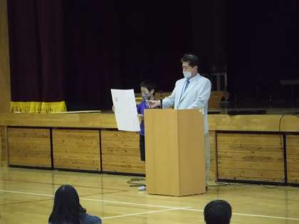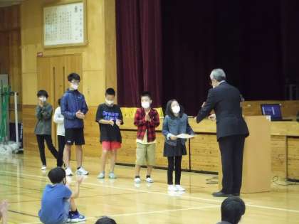 校長先生のお話の後は、書写や図工の作品展の表彰を行いました。