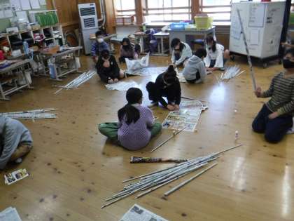 新聞紙を丸めて棒状にしたものをつなげてみました。