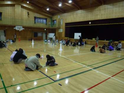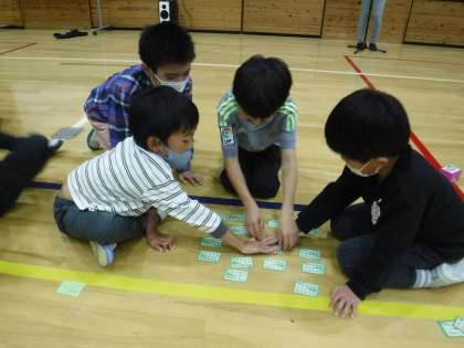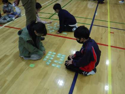 友だちグループで2〜3人組を作り、百人一首の札を取り合いました。