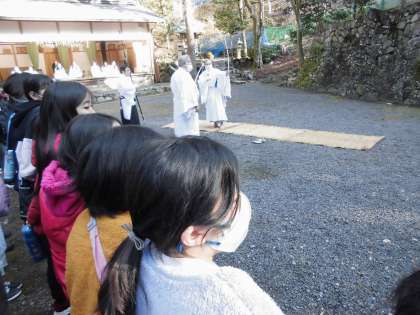 八瀬天満宮で行われましたお弓式の様子を見学に行きました。「お弓式は鬼を退治する儀式なのが分かった。」「東・南・西・北・天・地と,いろいろな方向に弓を放つことを知った。」と,理解を深めていました。