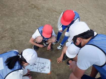 ねらい2に入り、チームごとに攻撃と守備の作戦を考えながら試合をしています。周りを見て動いたり、空いているところを狙ってパスをしたりすることもできるようになってきました。