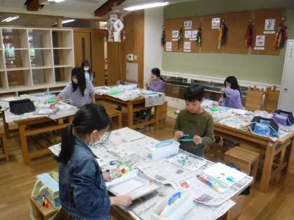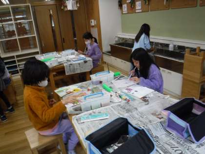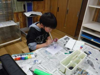 ビー玉やストローなどの用具を使って、絵の具で模様をつくりました。