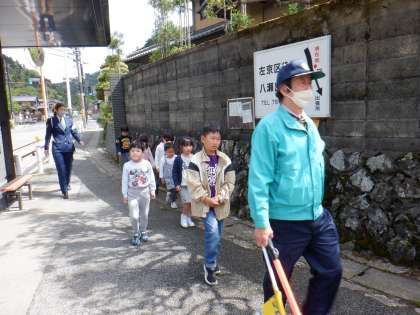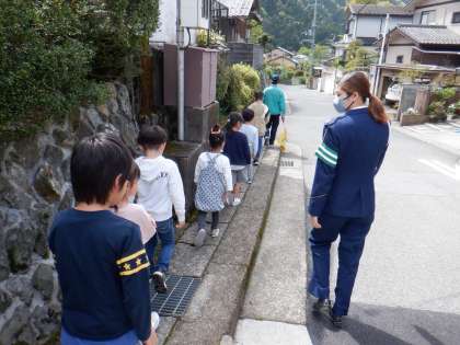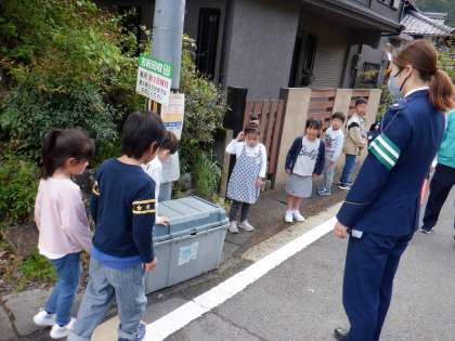 4月17日(月)に交通安全教室がありました。下鴨警察署の方と長井さんから正しい歩行の仕方について教えていただきました。どこを歩いたらよいのか、どこで左右を確認したらよいのかを実際に道を歩きながら教えていただきました。下校時には早速学んだことを生かしていました。