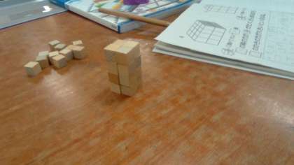 算数では「体積」の学習をしています。今日は、1立方センチメートルの立方体何個分かで体積を表せるということを学びました。授業の最後には、みんなで16立方センチメートルの立体をつくりました。同じ体積でも、いろいろな形の立体が作れるということが分かりました。