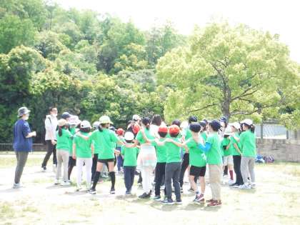 好天に恵まれ、池の周りのウォークラリーや全校遊びを楽しみました。
