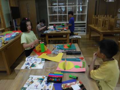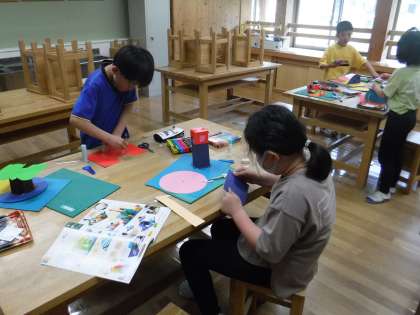 くるくると回る仕組みでどんなものを表現したいか考え、工作用紙や色画用紙を使ってつくりました。