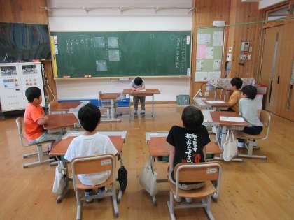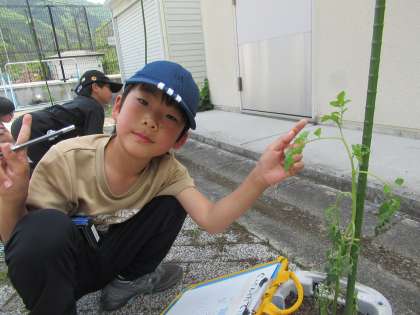 生活で観察したミニトマトの「観察メモ」をもとに、さらに国語でくわしく文にしていきました。『かんさつ名人になろう!』と、かんさつ名人ポイントを確認しながら書いていきました。「におい、かいでこよう。」「ちょっとさわってこよう。」とかんさつ眼が高まっていきます。発表タイムでは、「黄色い花は、バナナみたい。」「葉をにおったら、トマトのにおいがしたよ。」「葉っぱはざらざらしていた。」と…少し名人に近づいた子どもたちでした。