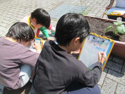 「きゅうりのにおいがする!」鼻を葉にぴったり当てて葉っぱのにおいをクンクンかぐ子どもたちの第一声でした。さらに、「どげとげがあるのは、葉っぱもきゅうりも同じやな。」「それがきゅうりの特徴なんじゃない!」と、話をする子どもたちを見ていて…「何か、深いところ見ているなぁ。」と感心しました。大きくなあれ!