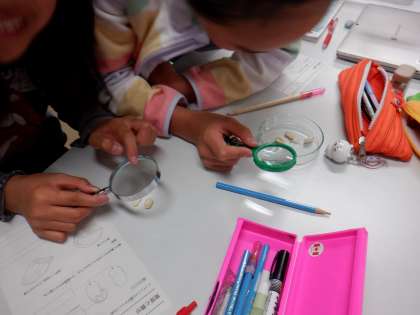種子の断面を見て、種子の中に養分をたくわえる部分があるかを調べました。虫メガネを使って細かい所まで観察をしていました。