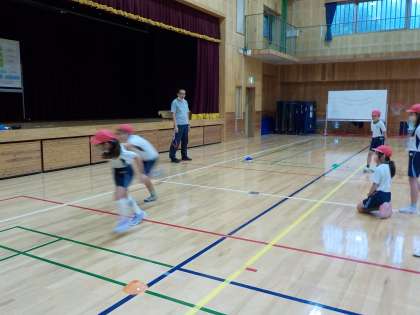 今日はあいにくの雨でしたが、体育館でリレーとダンスに取り組みました。