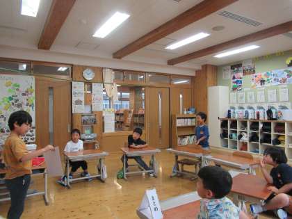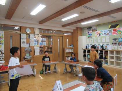「あったらいいなぁ〜!」と思うものを想像してみました。「いろいろな国にひとっとびできる靴があったらいいなぁ。」「このボタン一つで、世の中の人が長生きできたらいいなぁ。」「タケコプターみたいに、空がとべたらいいなぁ。」と…、子どもたちはいろいろと想像を広げていました。何十年先、何百年先の世界は、どんなすごいものであふれているのでしょうか…。それぞれの思いを交流しました。