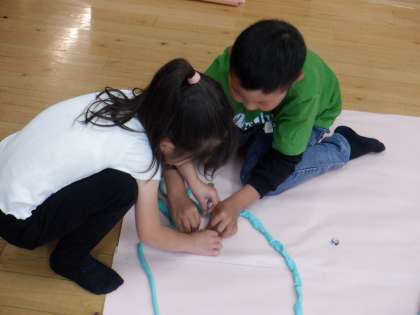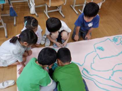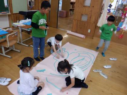 図工でねんどあそびをしました。ひものように細くして,そこから何をつくりたいか考えました。「迷路にしようかな」「わたしも」「ぼくも」「わかがしやさんをつくろう」みんな思い思いに工夫して楽しんでいました。