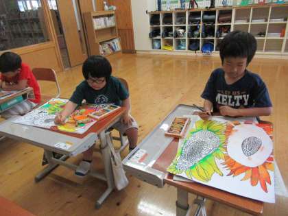 part2「ひまわりを描く!」BGMを聞きながら、黙々とひまわりの絵に向かう画伯たち…。線描写もよかったのですが、色をぬっていくことでさらに雰囲気がましましになってきました。ホームページを見て「うまいや〜ん!」とほめてくださることが、また励みになっているようです。もうすぐ仕上がりそうです…。