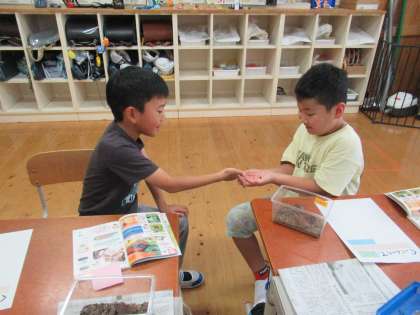 「ダンゴムシ」を探し、教室に帰って観察をしました。手にのせて「かわいい〜!見て見てうでにのぼる!」「つんつんすると、まるまるになるぅ。」「オスとメスの違い知っている!」と、大騒ぎ!!手のひら図鑑を使って調べていくと、いろいろなことが分かり、観察シートに書きました。これからお世話が始まります。