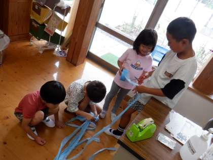 前回の図工でカラフルな色水をつくりました。この色水からなにができるかをみんなで話し合い,川をつくることにしました。いろいろ工夫して,川にカラフルな魚を泳がせました。