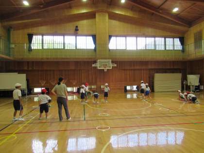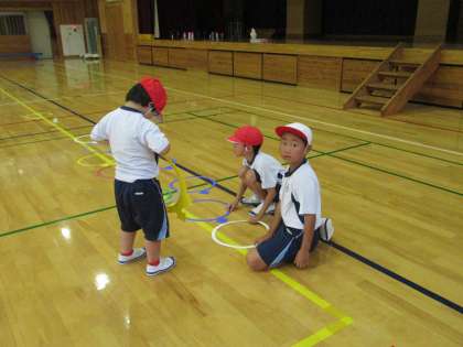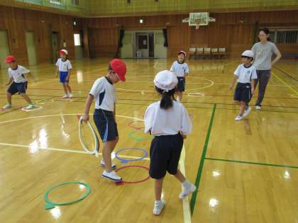 1・2先生がチームとなり協力して「とびあそび」をしています。「どのように跳んだら大きな一歩になるか…。」「けんけん跳び、パー跳びがうまくなるためには…。」「ぴょんぴょんとリズムよく跳ぶためには…。」など、遊びを通して練習しています。1・2年生のペアペアで協力し、アドバイスし合いながらがんばっています。