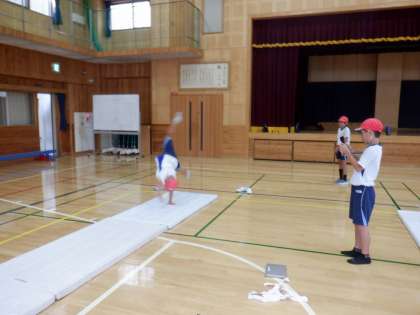 体育の学習では,「マット運動」をしています。同じ技に取り組むメンバーで、 「ゴムの場」や坂の場」など練習の場を考えてつくって練習に取り組んでいます。また、タブレットを使い手本の動画を見たり、自分の姿を動画にとったりと、課題を克服するための工夫もしています。これまでできなかった技が一つでも多くできるようになってほしいです。