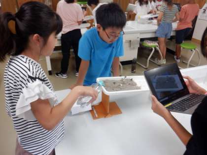 実際に川の模型を作って、流れる水の働きを調べる実験をしました。実験を通して、「曲がる部分では土が大きく削られる」「水の流れによって土が流されていく」といったことに気づいていました。