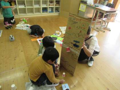 生活科「あそんで、ためして、くふうして」を楽しく勉強しています。前半は、いろいろなしかけを学びました。後半は、その学びを生かして「おもちゃづくり」をしています。たくさんの『ガラクタ』から材料を選び、試しながら作っています。