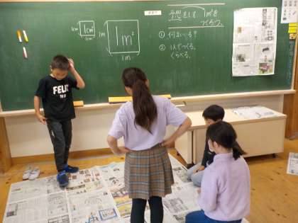 新聞紙を使って、1平方メートルをつくりました。思っていたよりも、大きかったようで、子どもたちはびっくり!!少し、量感がつかめたようです。