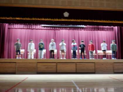 体育館での通し練習が始まりました。大きな声でセリフを言ったり、動きを大きくしたりすることを意識しながら練習をしています。