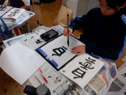毛筆で「白雲」と書きました。「白」と「雲」の字の大きさのバランスに気をつけながら丁寧に書きました。「はらい」や「はね」なども上手になってきました。