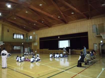 日本の伝統文化である着物に親しもうと、4〜6年生が着付け体験学習を行いました。