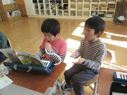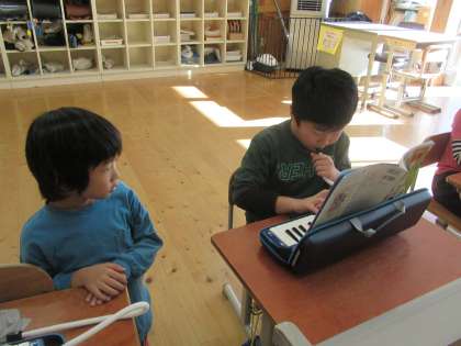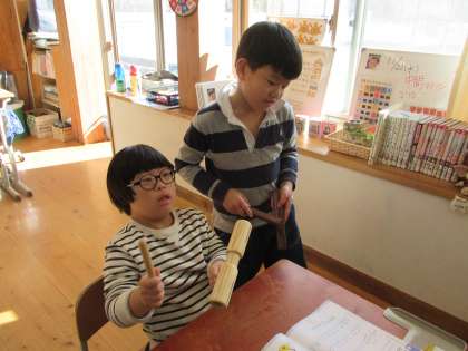 「小ぎつね」の曲をけんばんハーモニカや打楽器で練習をしています。ペアになり、アドバイスし合いました。「もっと、たまごの手にした方がいいよ。」「タンギングできていてうまかったよ。」「間違えなかったけど、指番号もがんばってね。」など、友だちからのアドバイスは参考になるようです。みんなで一緒にうまくなっています。