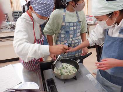 友だちの日の学習をしました。今回のテーマは「朝鮮・韓国の文化に親しもう」です。そこで、みんなで「チヂミ」を作りました。グループで手際よく調理を進めていました。出来上がったチヂミを食べると、「おいし〜!」という声がたくさん聞かれました。これからもいろいろな場面で、外国の文化に親しんでいってほしいと思います。