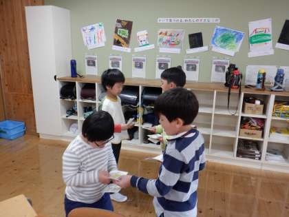 前の時間につくった名刺を交換して、自己紹介をし合いました。一人一人の好きなものがかかれた名刺をもらって、みんなとてもうれしそうでした。