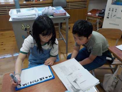 折れ線グラフを学習中の4年生。今日は、棒グラフと折れ線グラフの良さについて話し合いました。変わり方は、折れ線グラフを使う方がいいという考え方に気付くことができました。