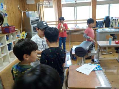 来週から、3年生も金管を演奏し始めます。今日は、楽器見学をしました。試しに持たせてもらったり音を聴かせてもらったり、3年生は興味津々な様子でした。
