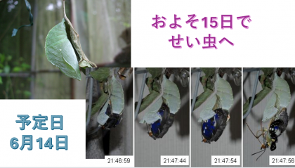 3年生だけで観察するより、八瀬のみんなにも見てもらおうと、玄関のところにさなぎを置いています。6月14日の金曜日が羽化の予定です。9センチにもなるオオムラサキの成虫が見られるか。みんなで観察していきましょう。